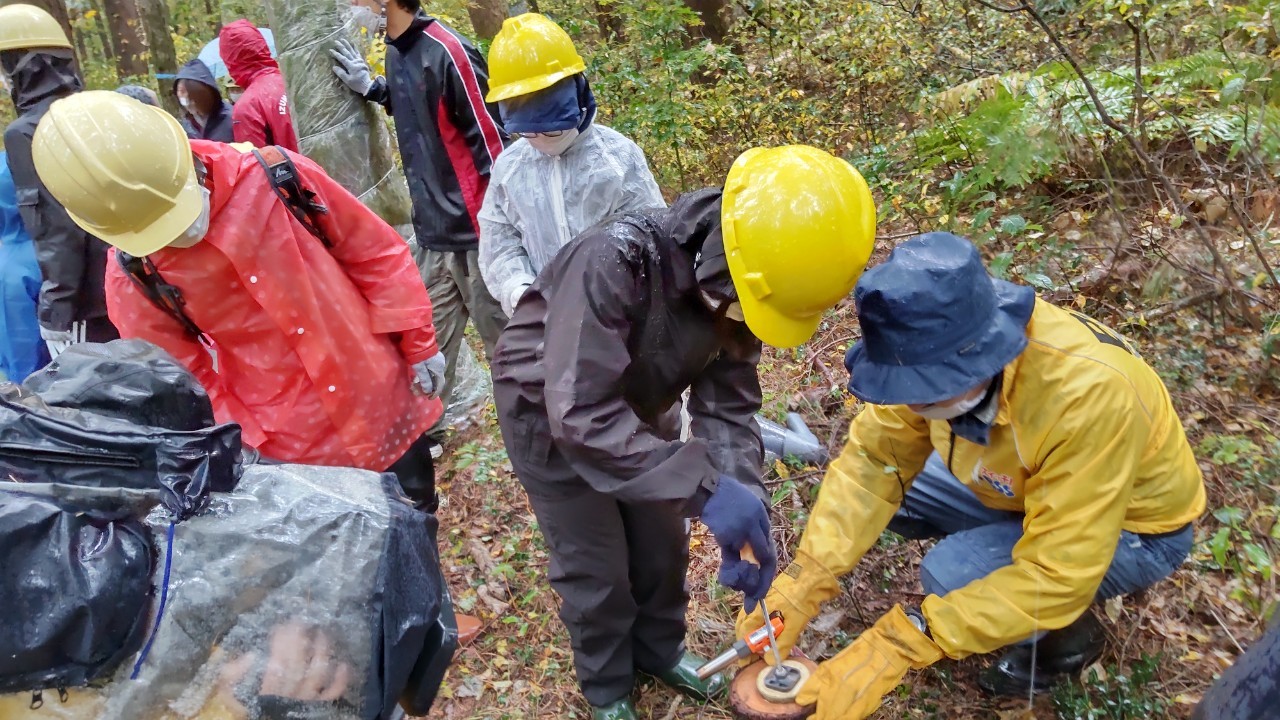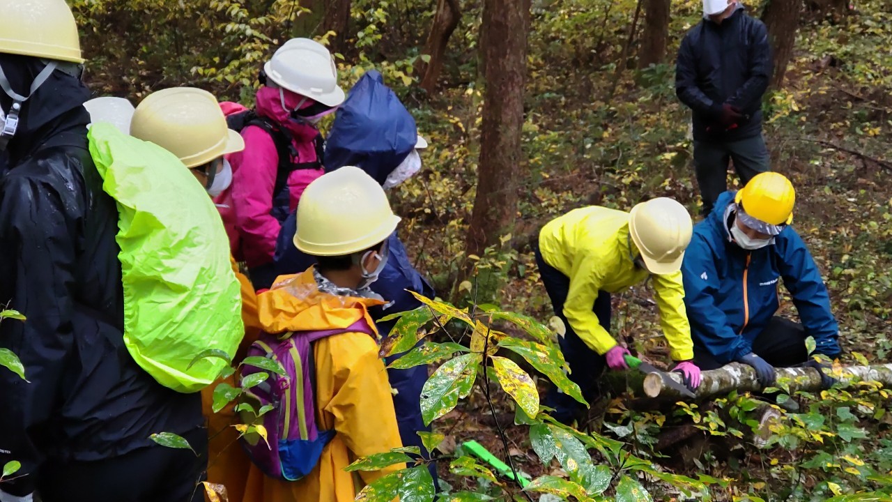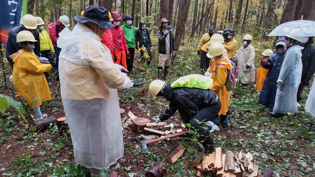 鳥取県内で環境保全活動に取り組まれているNPO団体「とっとり希望化計画21」に協力いただき、参加した親子約25名が枯れ木の伐採等の森を守る活動や薪割り、コースター作りなどの体験をしました。当日は雨で肌寒い天気でしたが、参加した親子は普段できない森林での体験に熱心に取り組み、島根大学松本教授や鳥取大学清水教授からの環境学習で、森の大切さを学びました!